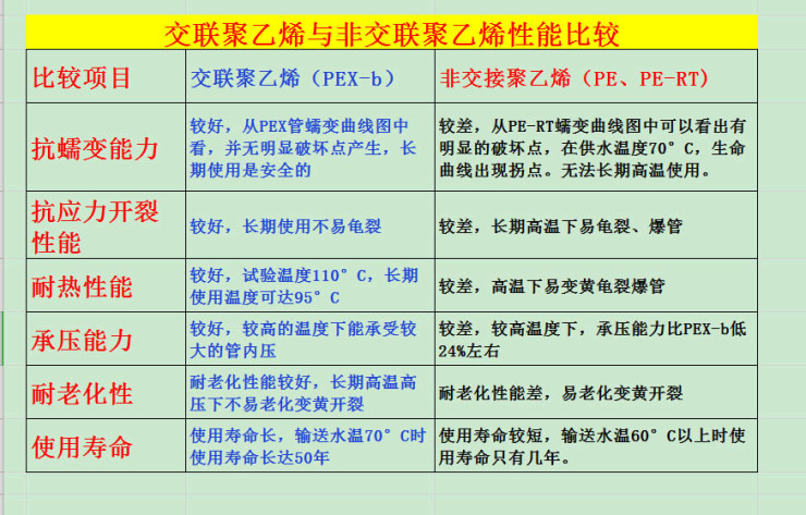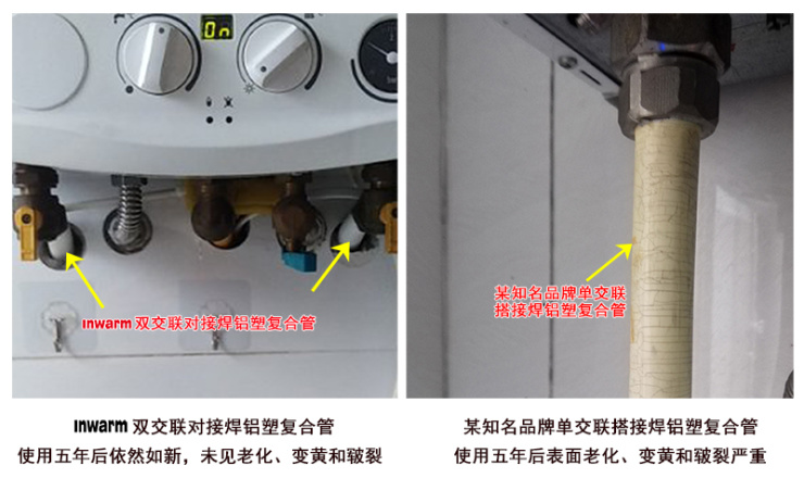 一般非交联铝塑管的内外层和单交联铝塑管的外层所用的材料PE和PE-RT居多,由于PE为非交联聚乙烯,其稳定性较差,在长期高温度高压力的情况下,容易老化开裂,常规使用的寿命较短;而PE-RT不耐高温,生命周期有拐点,在供水温度高于60度以后,常规使用的寿命只有7年左右,因此一般只能用于冷水系统,不能用于高温供暖系统,但一般花了钱的人这个不了解,有的厂家将单交联铝塑管称之为热水管,用于生活热水或供暖系统,其隐患十分巨大,在高温供暖系统使用时,几年后铝塑管的外层就会皲裂粉化,严重的外层全部脱落,铝层漏在外面,其耐压强度大大减弱,很容易出现爆管或铜接头位置出现渗漏水的现象发生。