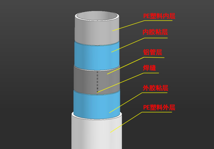 铝塑复合管,简称铝塑管,在供暖、生活用水和太阳能热水器输送热水上使用十分普遍,由于其不透氧、耐用、具有金属管特性、易弯曲不回弹,特别是在世界供暖行业成为较为高端的管材。但很多人对铝塑复合的知识知道的很少,无法分辨质量的好坏,本文为大家详细的介绍铝塑复合管的相关知识。 铝塑复合管的结构:铝塑复合管从内向